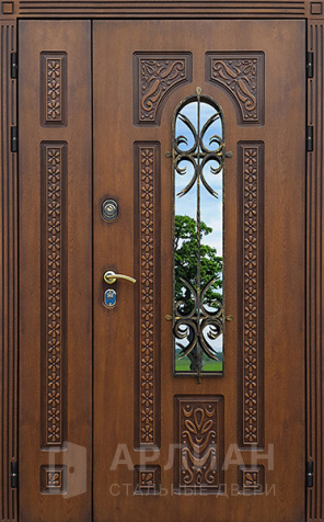 Элитная входная двустворчатая дверь массив дуба с ковкой и стеклом №24