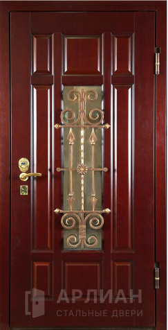 Входная коричневая дверь в частный дом со стеклопакетом и ковкой №11